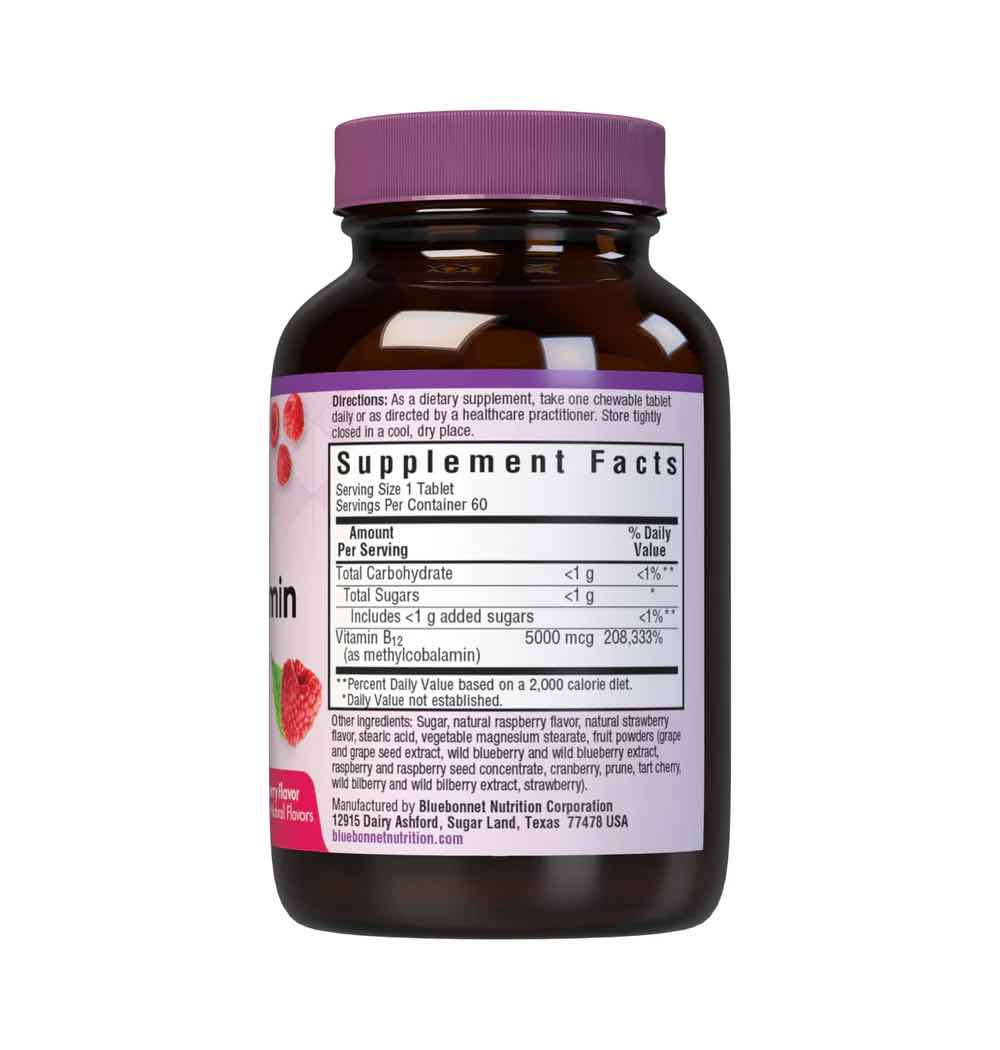 5000 mcg of the active form of Vitamin B12, Methylcobalamin. Raspberry Flavored Chewable Tablets. Sweetened with EarthSweet®. Non-GMO, Vegan, Kosher Certified, Soy-Free, Gluten-Free, Dairy-Free